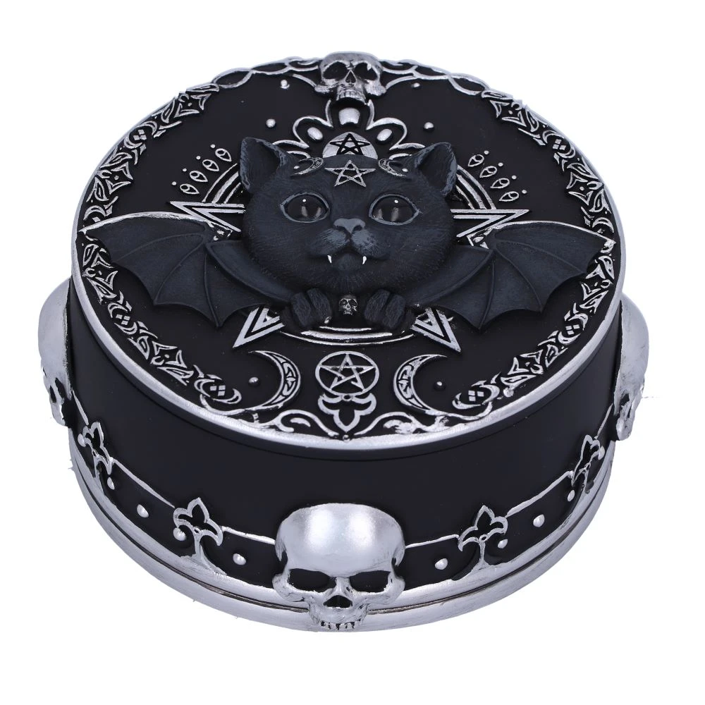 Adaugă un element gotic colecției tale cu cutia de bijuterii "Malpuss" de 10,8 cm. Decorată cu detalii argintii și simboluri satanice, această cutie din rășină pictată manual este perfectă pentru păstrarea micilor comori.