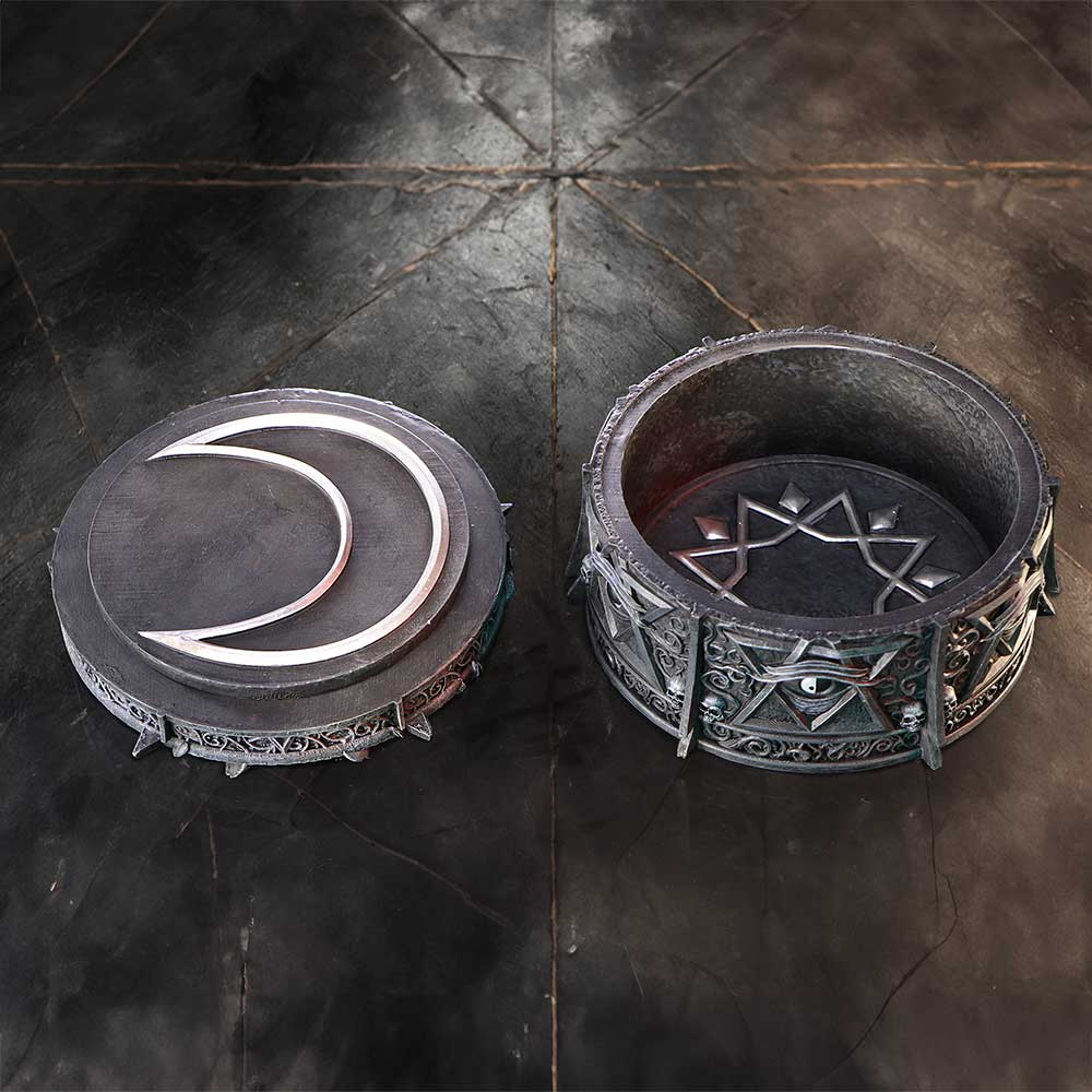 Descopera cutia de bijuterii Hoard of the Baphomet de la Nemesis Now, un ornament impresionant care adauga o nota de mister si stil gotic oricarui spatiu. Aceasta cutie rotunda de 11 cm prezinta pe capac o reprezentare detaliata a lui Baphomet, inconjurat de serpi, cranii si simboluri arcanice, toate meticulos sculptate si pictate manual. Realizata din rasina sintetica de inalta calitate (polirasina), aceasta cutie nu doar ca ofera un spatiu sigur pentru pastrarea obiectelor de valoare, dar si serveste ca o piesa de decor remarcabila. Capacul detasabil permite accesul facil la interior, facand-o atat practica, cat si estetica. Este un cadou ideal pentru pasionatii de ocult, decoruri gotice si colectionarii de obiecte unice.