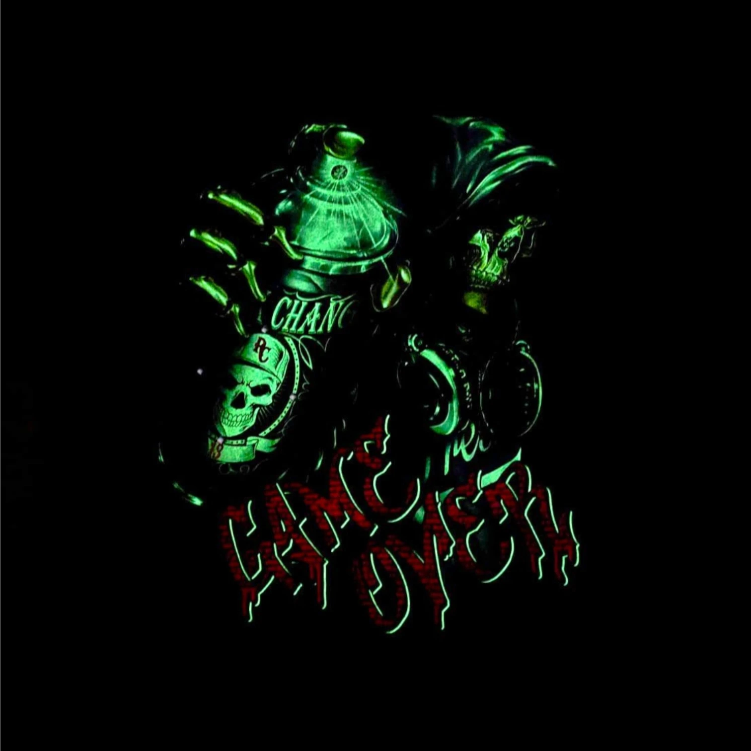 Tricou RockChang unisex negru din bumbac, cu imprimeu frontal reprezentand un craniu urban cu hanorac, casti DJ si spray graffiti. Include efect Glow in the Dark – anumite elemente ale imprimeului devin luminoase in intuneric dupa expunerea la lumina. Design modern street style cu mesaj mare Game Over. Grafica intensa, contrast puternic si detalii luminoase. Croiala regular fit, confortabil si rezistent. Fabricat in Thailanda. Ideal pentru stil urban, hip hop, streetwear si tinute alternative.